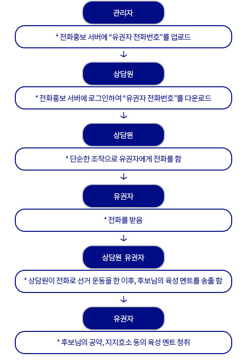 * 공직선거법에 따른 송•수화자 간 1:1 직접 통화 방식이며, 부수적으로 후보님이 녹음한 지지 호소, 공약 내용 등의 육성 맨트를 직접 들려줄 수 있습니다.